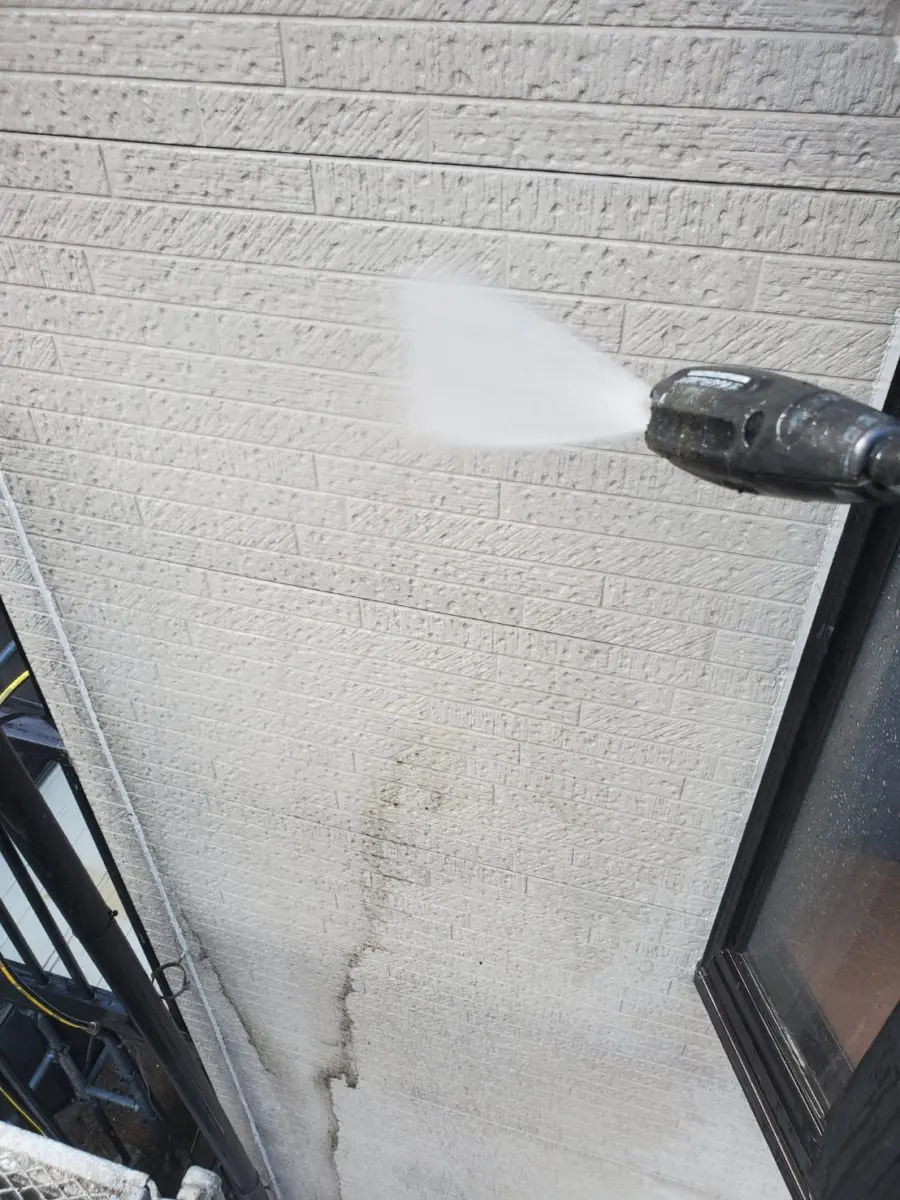 コーキングの打ち替えも終わりましたので、塗装前にバイオ洗浄で壁の汚れを落とします。