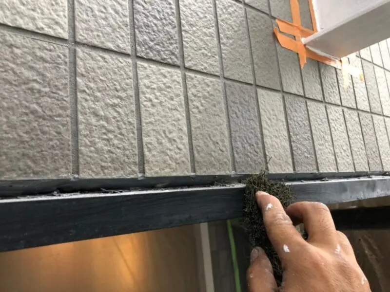サッシなどのケレン作業と塗装しない部分に養生を行いました|大阪市の塗装現場の様子