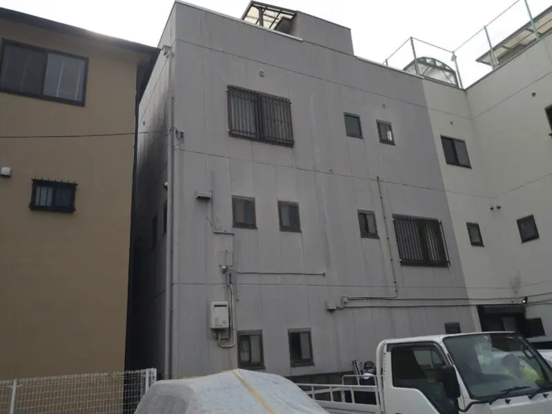 摂津市にあるビルの外壁塗装工事、施工前の状態と足場設置