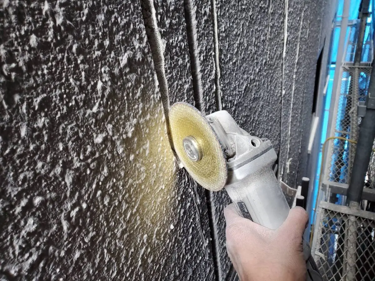 大阪府摂津市の現場にて外壁のクラック補修、Uカット〜プライマー塗布の作業を行いました!