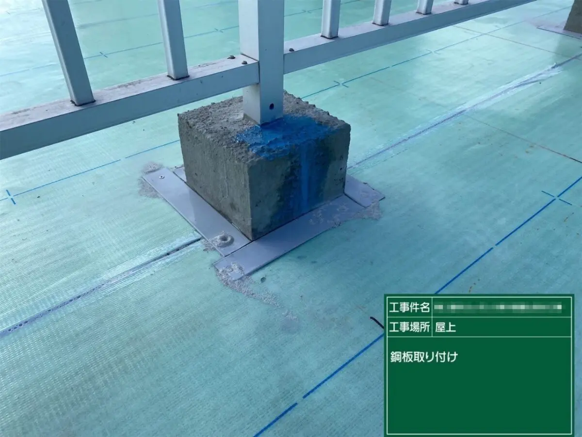 手すり支柱の穴あけ作業についてはこちらの「現場レポート:大阪府大阪市 ビル屋上の防水工事 手すり穴あけ〜Uマット敷設」をご覧ください。