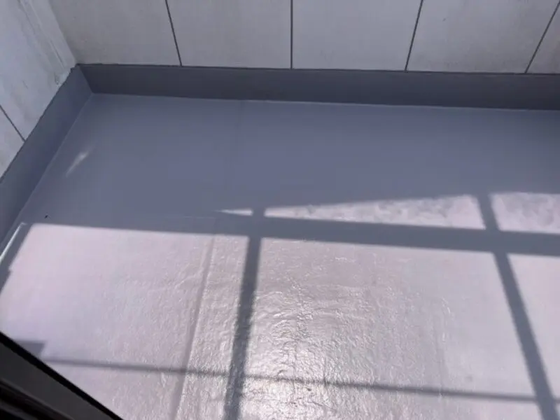 前回の現場レポートでお伝えしましたが、防水層ができたらトップコートを塗って防水を仕上げていきます。トップコートは防水層を保護する役割があり、耐久性を上げてくれます。