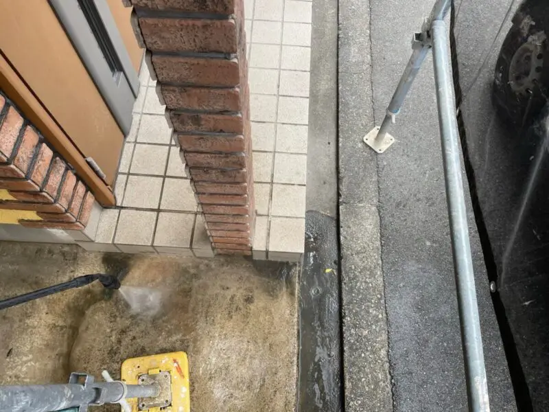 大阪府大阪市の外壁塗装工事にて、本日は土間コンクリートと通路の高圧洗浄作業をお伝えします。