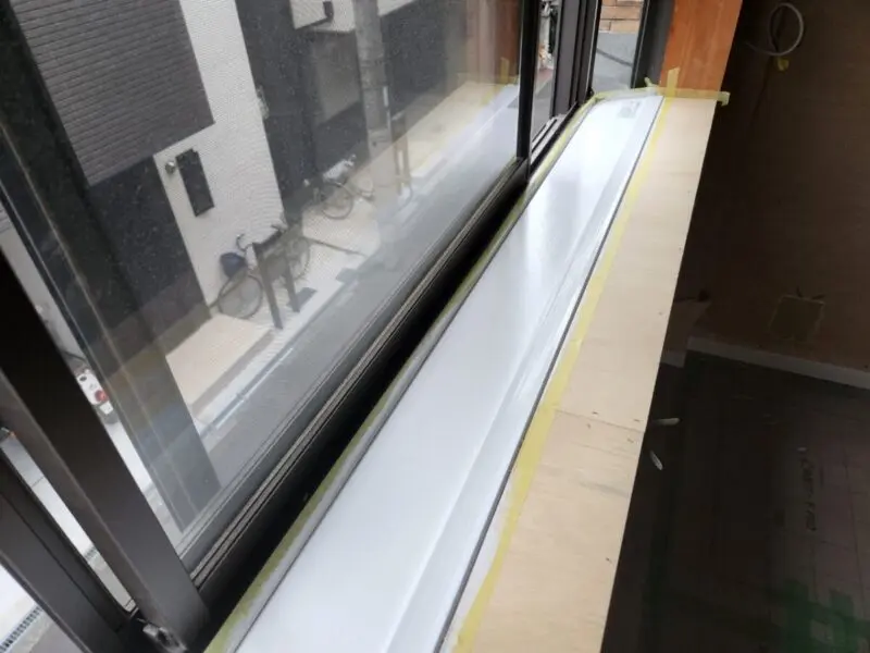 大阪府大阪市の外壁塗装工事にて、本日は内装工事の窓枠塗装とコーク補修をお伝えします!