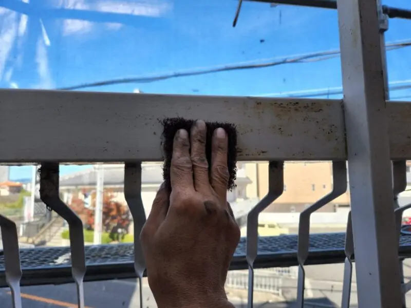窓手すりの下地処理を行いました。手すりは錆びていましたので、ケレンで除去していきます。サビは塗装の付着力を落としてしまいますので、しっかり下地を整えることが大切です。