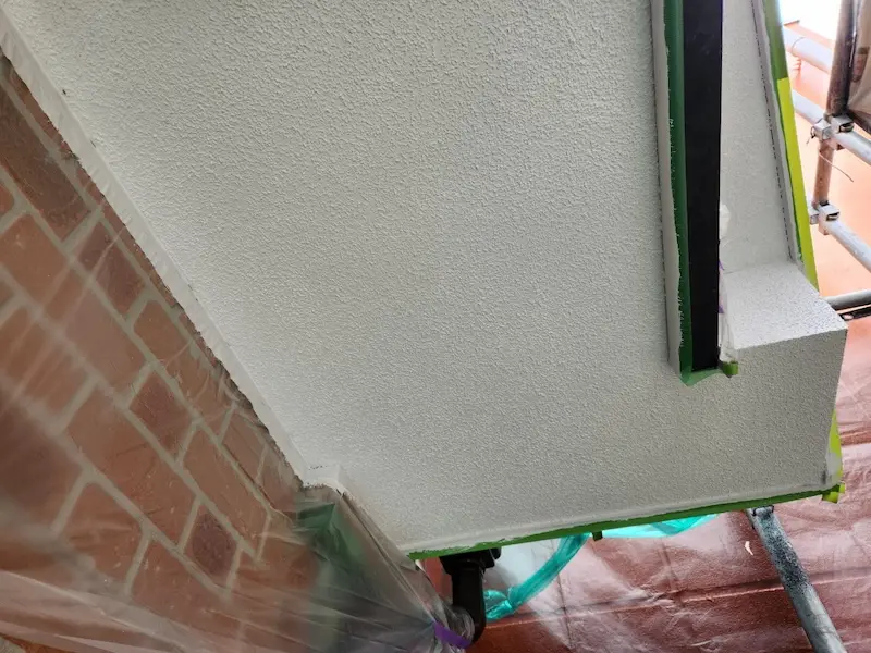 塗装では塗料が飛散しますので、外壁に塗料がつかないように養生してから軒天井の塗装に取り掛かりました。
